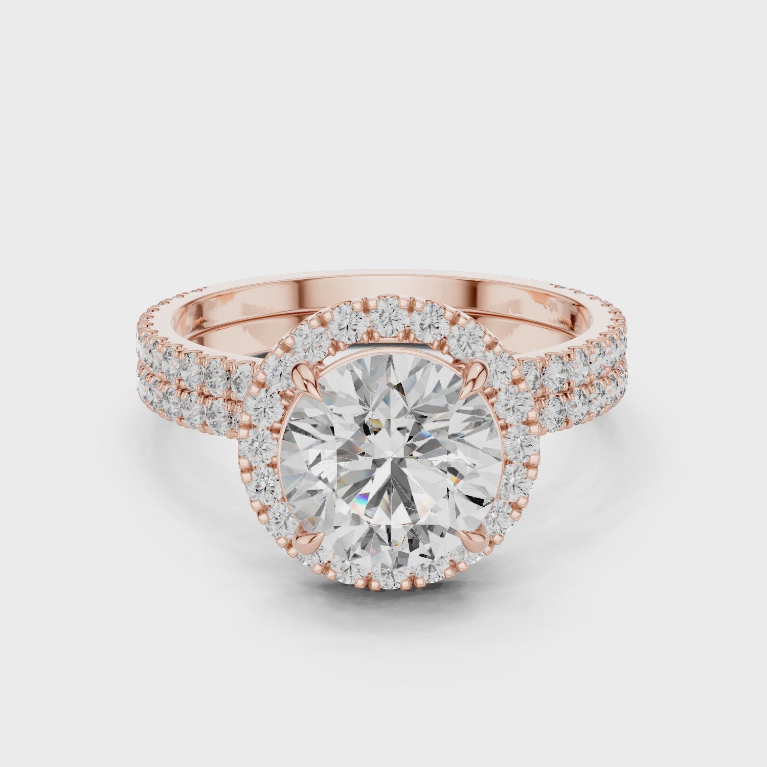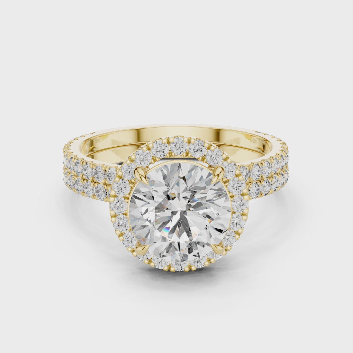 Kaia Mia features a stunning round brilliant center stone available in 1, 2, or 3 carat options with a premium D to E color grade. The center diamond is surrounded by a radiant halo of pave set diamonds that amplify its sparkle and brilliance. Double rows of diamonds along the band add luxurious depth and symmetry. This exquisite 14K gold engagement ring combines timeless elegance with exceptional craftsmanship, making it perfect for brides who love classic beauty with modern sophistication.