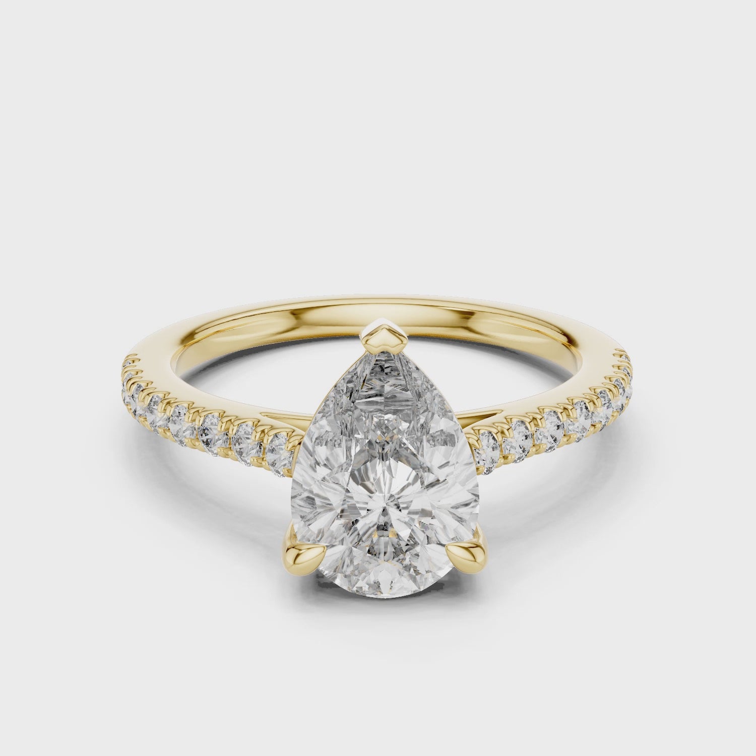 An icon of elegance, Sabine is a solitaire that makes a statement from every angle. At its heart is a pear-shaped diamond, available in 2.5, 3, or 4 carat options, hand-selected in the finest D–E color for breathtaking sparkle and clarity. The diamond’s brilliance is amplified by a pavé band in 14 K gold, creating a radiant display of light with every movement. Sophisticated and undeniably glamorous.
