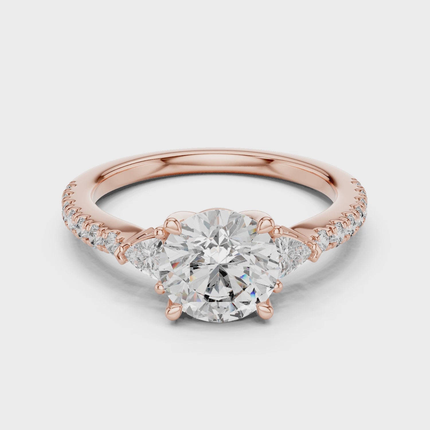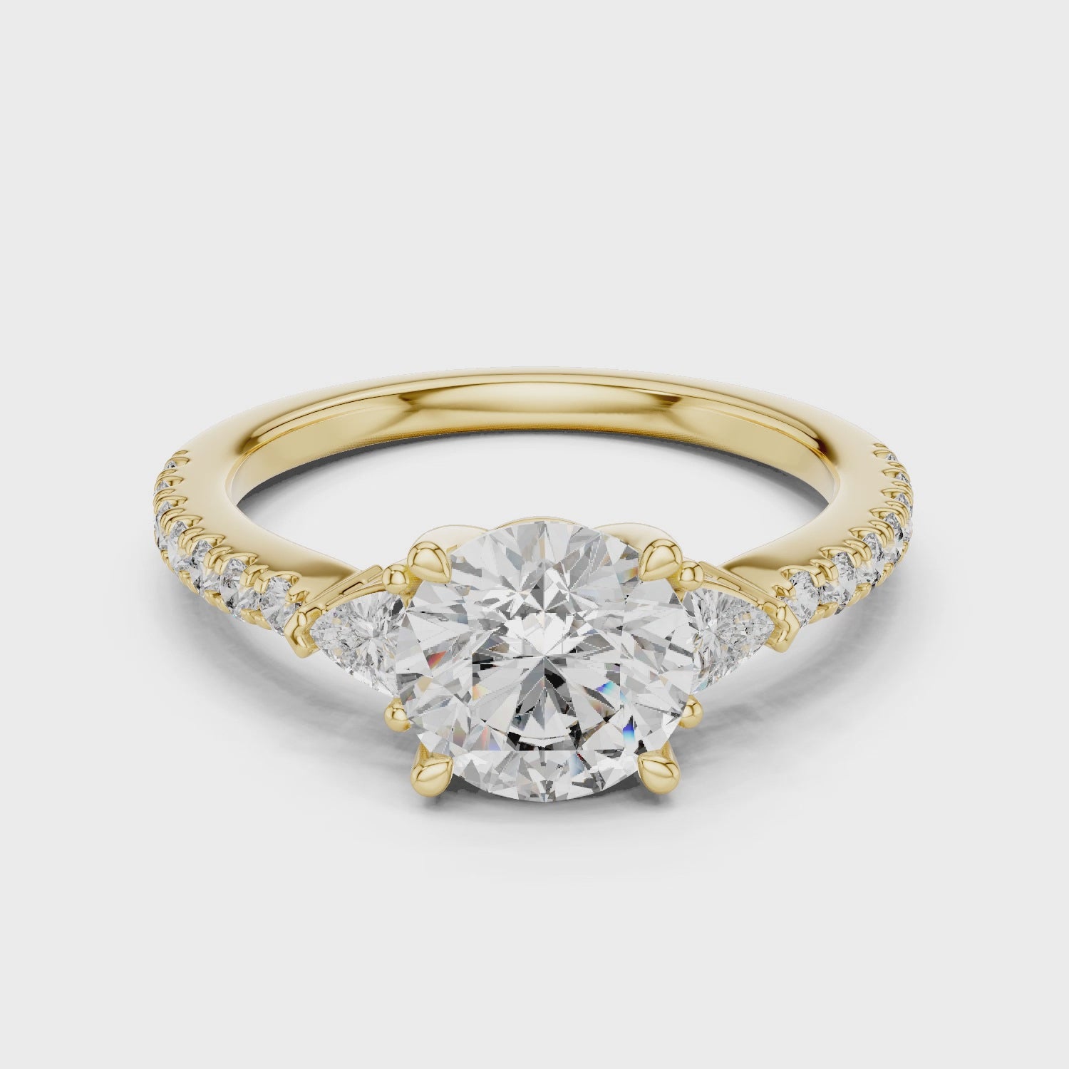 A dazzling three-stone design that radiates brilliance and harmony. At its center lies a round brilliant diamond, available in 1, 2, or 3 carat options, selected in the finest D–E color for exceptional sparkle and purity. Flanked by two perfectly matched trillion-cut side diamonds and a delicately set pavé band crafted in 18 carat gold.A true celebration of romance, it captures the beauty of love in perfect balance.