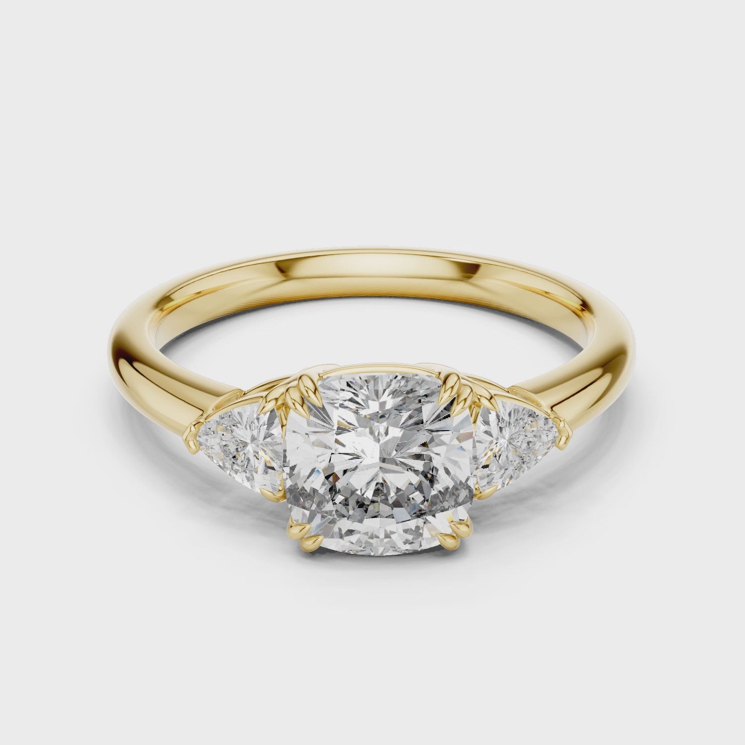 An elegant three-stone ring that celebrates brilliance and balance. At its heart lies a cushion-cut center diamond, available in 1, 2, or 3 carat options, in exceptional D–E color for remarkable purity and sparkle. The centerpiece is flanked by two perfectly matched trillion-cut diamonds, adding symmetry and fire to the design. Set on a polished 14K gold band, this ring beautifully symbolizes the past, present, and future of love.