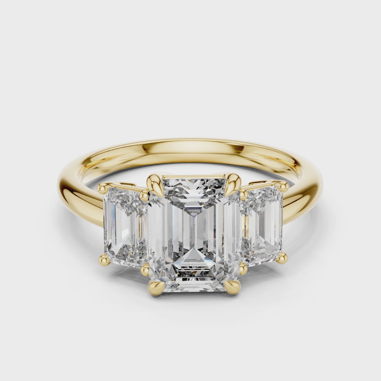 An elegant three-stone ring crafted in polished 14K gold, showcasing an emerald-cut center diamond available in 1 or 2 carat options. Flanked by two perfectly matched emerald-cut side stones of 0.5 carats each for the 1 carat center, and 1 carat each for the 2 carat center. All diamonds are in the exceptional D–E color range for remarkable brilliance and purity. A timeless design that symbolizes the past, present, and future of love.