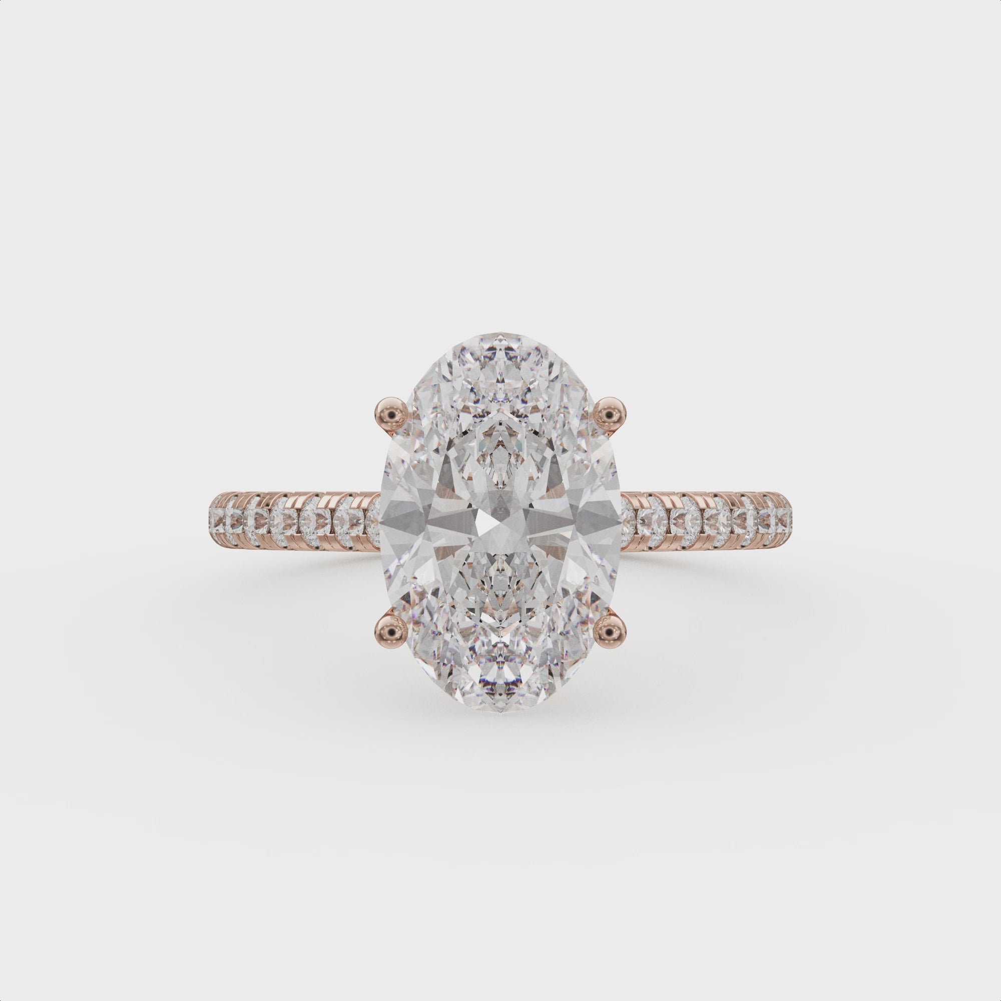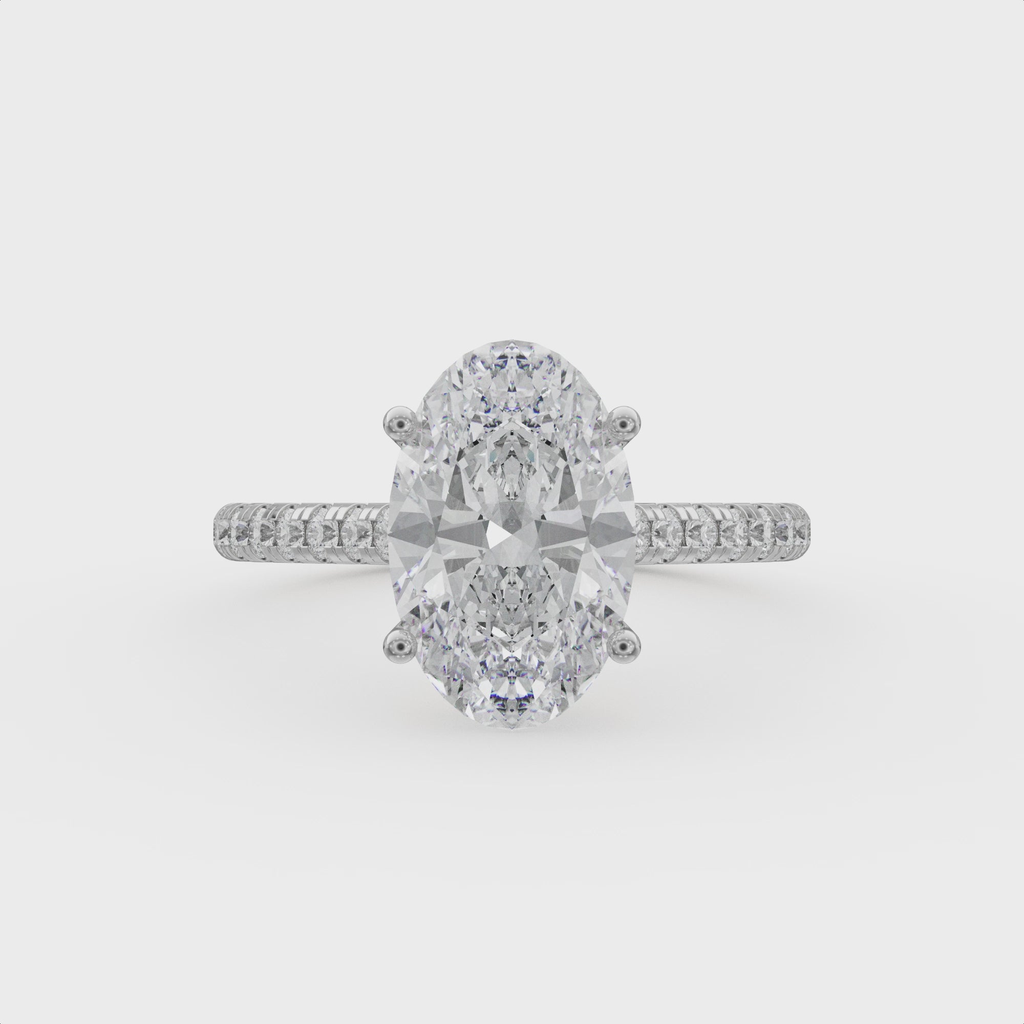 The Natasia Ellora engagement ring is an elegant expression of timeless beauty and refined craftsmanship. It features a perfectly cut oval diamond set in a delicate four prong design that allows light to flow through every facet, creating exceptional brilliance and fire.