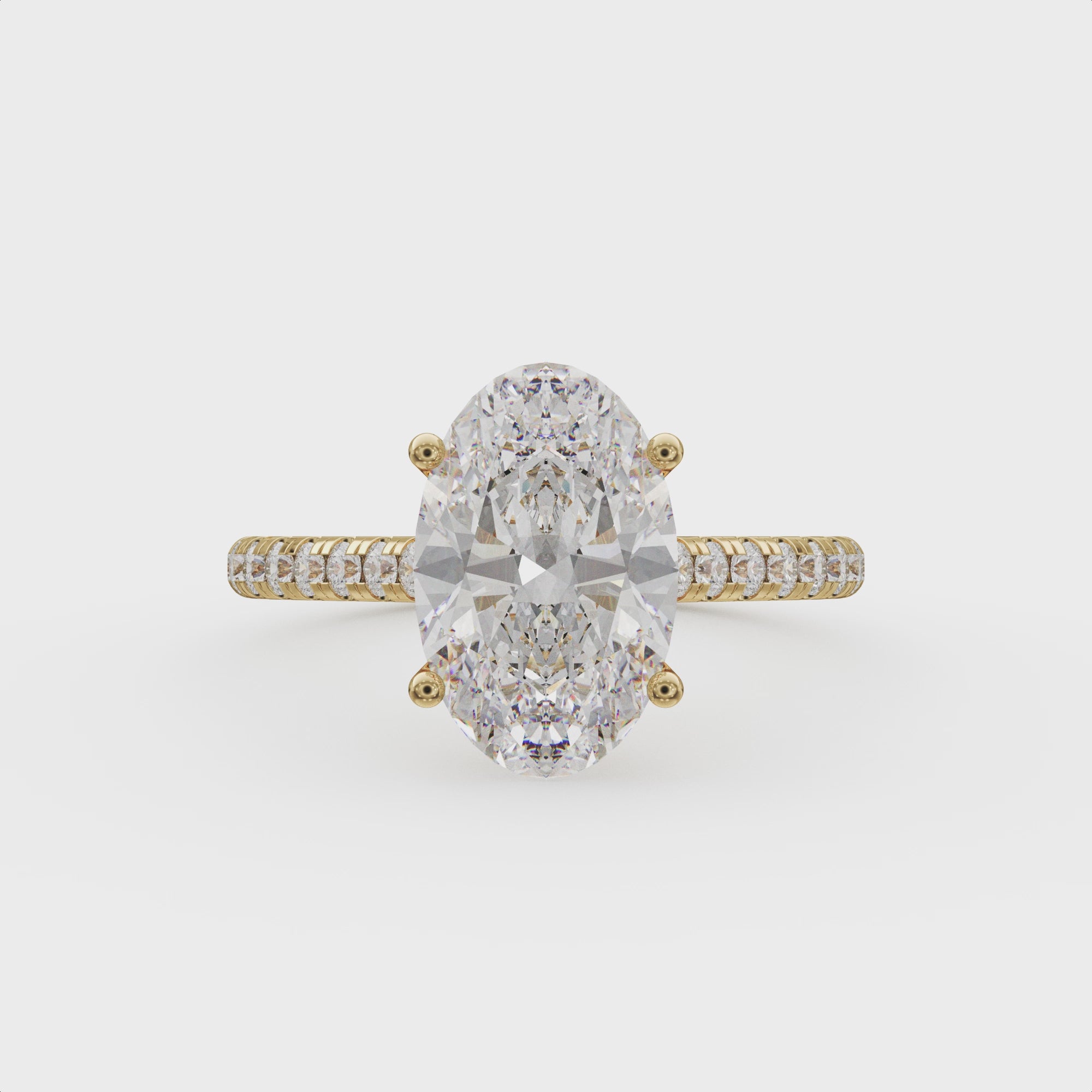 A graceful pavé diamond band adds soft shimmer and complements the luminous center stone, giving the ring a balanced, feminine silhouette. Available in 2, 3, and 4 carat options and set in 14K gold, the Natasia Ellora offers versatility and sophistication for every style.