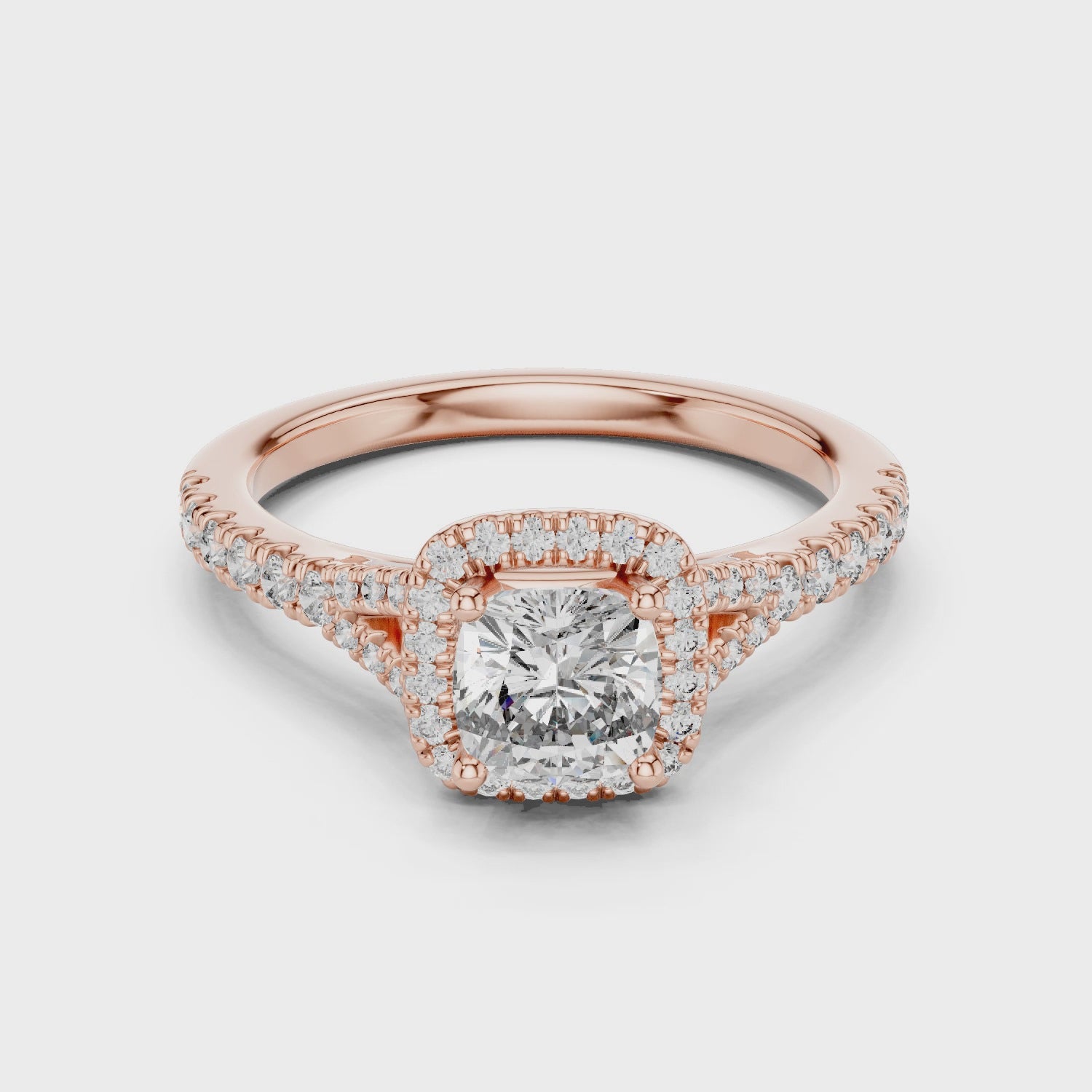 Romantic and refined, Juliette is a halo design that celebrates the fire and depth of a cushion-cut diamond. Available in 1, 2, or 3 carat center stone options, each diamond is hand-selected in the finest D–E color for exceptional brilliance and purity. A luminous halo of pavé-set diamonds surrounds the centerpiece, with additional pavé along the band, all crafted in 14K gold. Graceful and radiant.