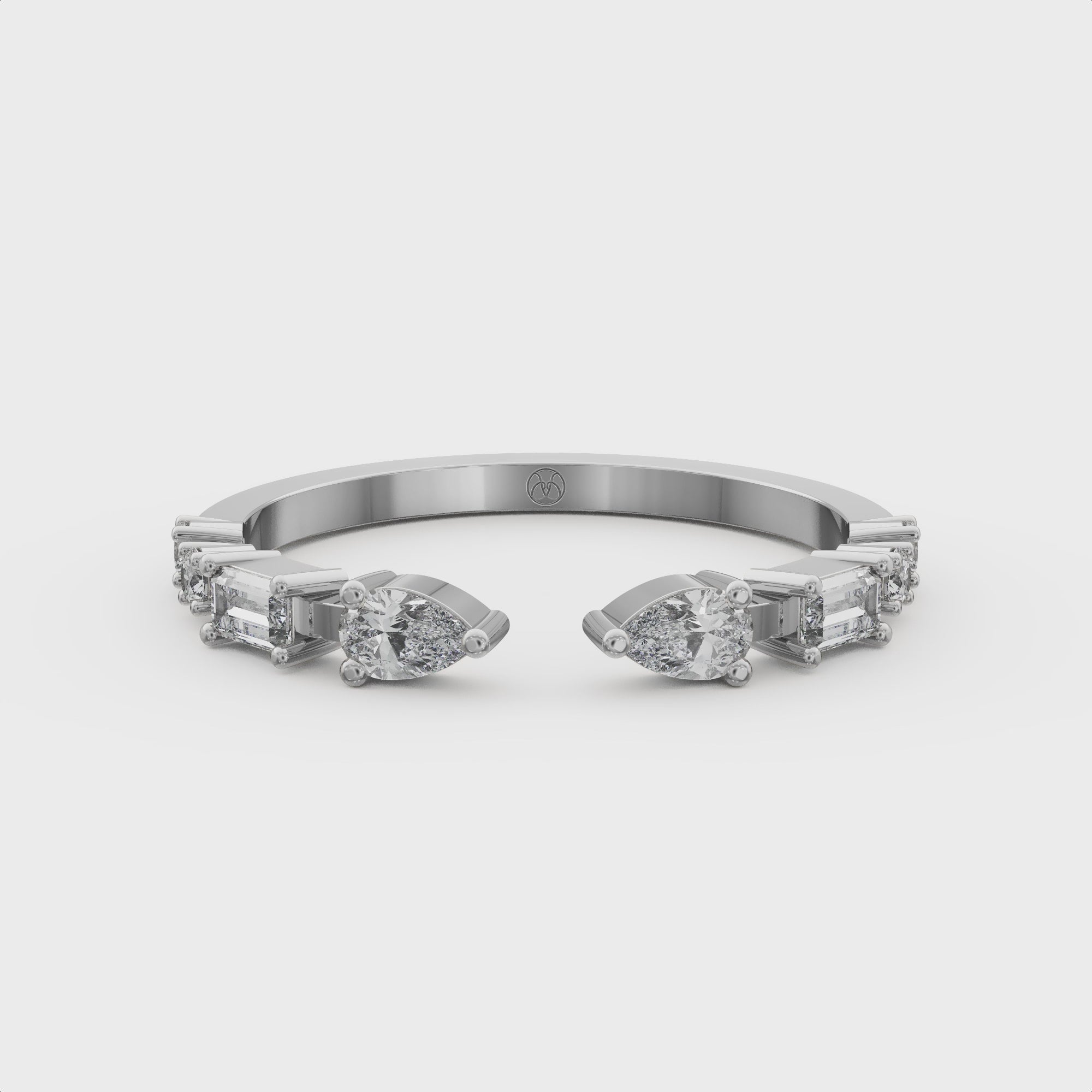 Knox Verona is a refined stackable band that also becomes a beautiful wedding band, created with quiet luxury and poetic grace. Pear, baguette and round diamonds form a delicate composition, allowing the light to dance gently across the finger.