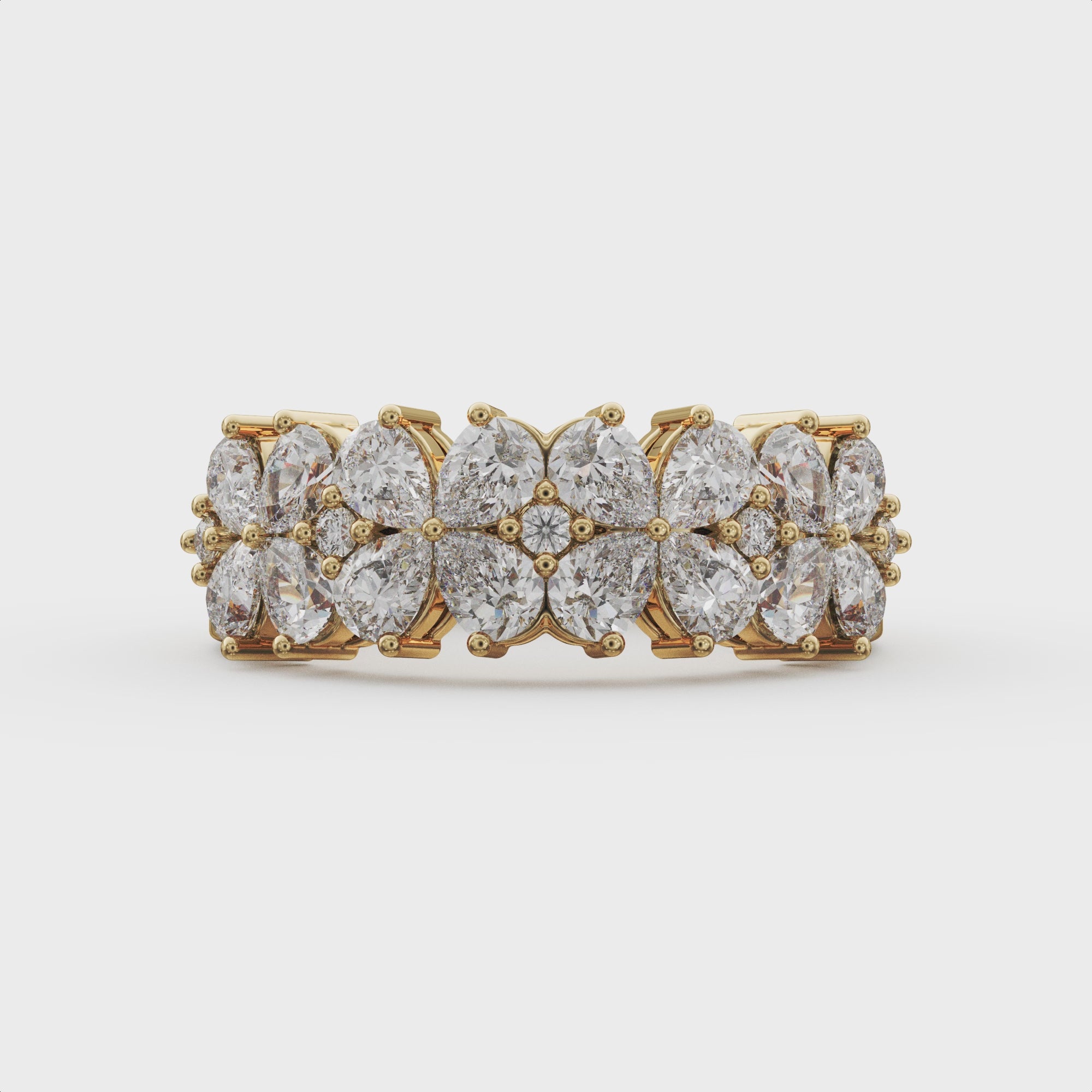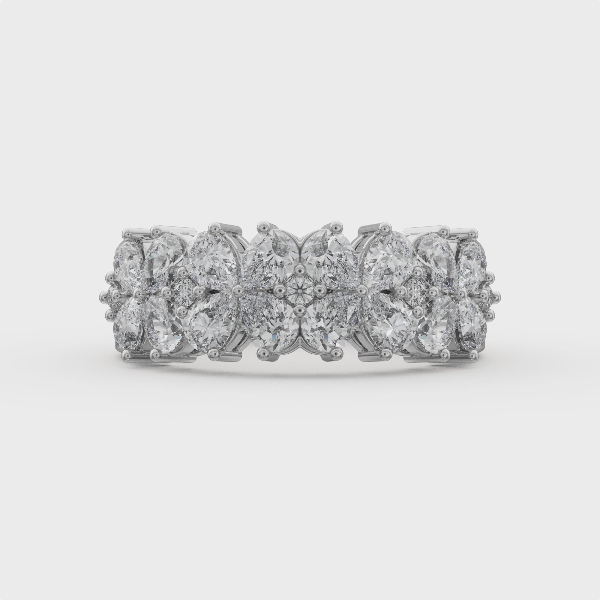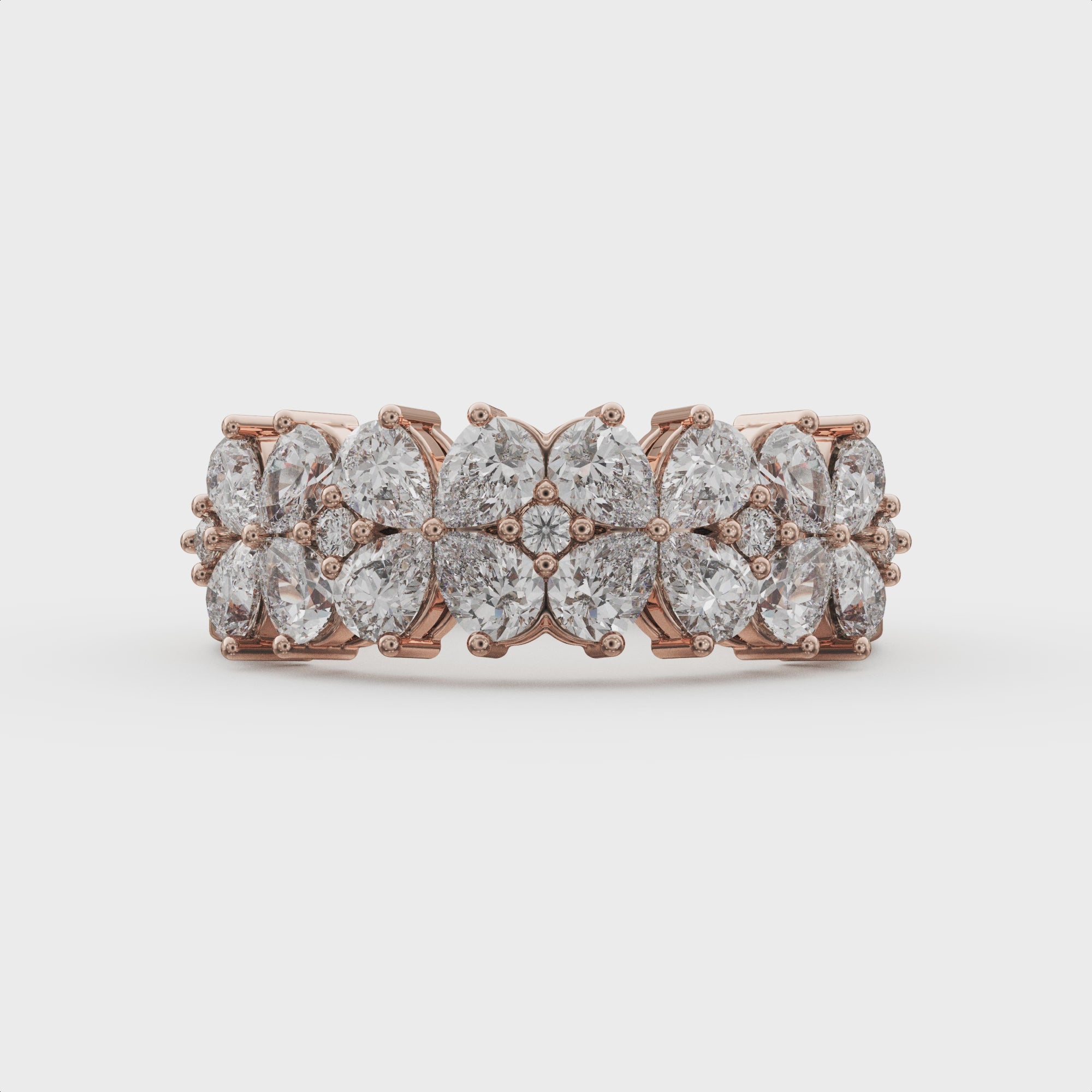 With an overall diamond weight of 1.8 carats in exceptional E–F colour, set in 14K gold and fine clarity, this ring embodies luxury and craftsmanship. The arrangement of four pear flowers creates a bold yet graceful statement, making it ideal for both wedding and anniversary wear.
